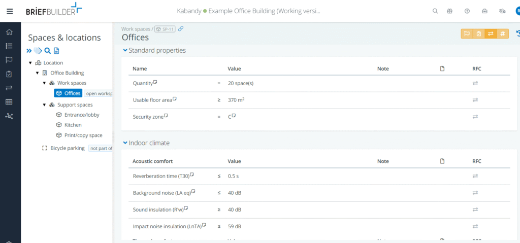 To meet all these requirements, a systematic approach is mandatory. Gone are the days when you could manage project quality from a sheet of paper or a simple checklist. Fortunately, platforms such as BriefBuilder offer valuable help in organising and managing requirements in a unified way. For all project participants (i.e. architects, contractors, engineers), the result is a brief or digital file, online, with clearly stated requirements and verification rules. For example, with one click you can get an overview of all requirements for a given room type (e.g. offices), ranging from functional constraints (e.g. minimum usable floor space, number of office rooms) to indoor environmental conditions (e.g. acoustic and thermal comfort), adjacencies (required proximity between main functions) or items (furniture and equipment).