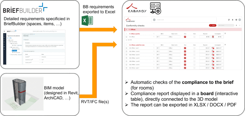 The workflow is a two-step process: first, exporting the brief from BriefBuilder to Excel; then importing it into Kabandy, along with an IFC file of the BIM model to be checked. This way we have both as-designed and as-built information in the Kabandy workspace.