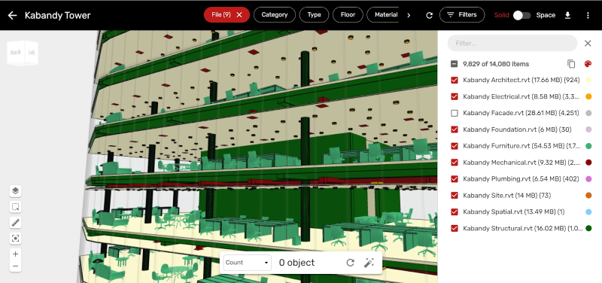 Once the checklist is established, the question of how to perform quality control on the entire model arises. To begin with, non-BIM expert users can use the intuitive viewer to quickly analyse their models. They can isolate features by combining filters and applying colours to view the data on the 3D model (see Figure 2). This way of working is well suited to the early stages of design, when team members need quick feedback on the quality of a model.