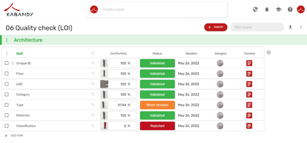As the project progresses, the complexity of the model increases. It therefore becomes essential to automate the process using predefined rules. Kabandy allows users to configure geometric operators and regular expressions to perform quality checks (e.g. naming convention of classification codes or correct definition of object parameters). These rules are typically written by the BIM Manager in a ‘rules template’ that can be used by all to automate the generation of compliance reports for their models. The automation includes creating the viewpoint, the compliance score for each checkpoint, editing notes and assigning a status. The report is then shared in an online workspace for follow-up until the issues are resolved (see Figure 3)